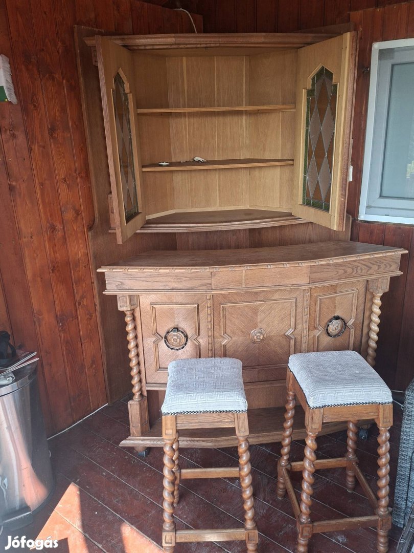 Kihúzható alsó résszel, két bár székkel és felül két ólomüveges ajtókkal.