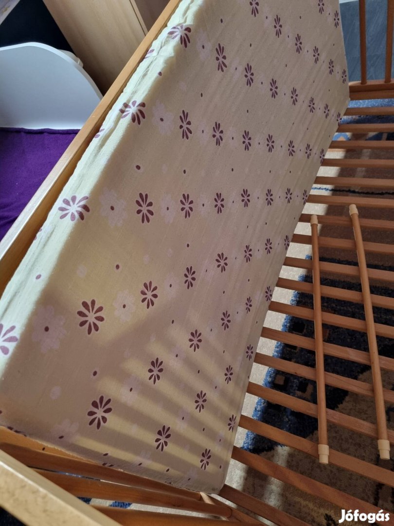 Alig használt, 120X60-as, jó állapotú, három magasságra állítható rácsos gyerekágy matraccal, ágyráccsal eladó.
