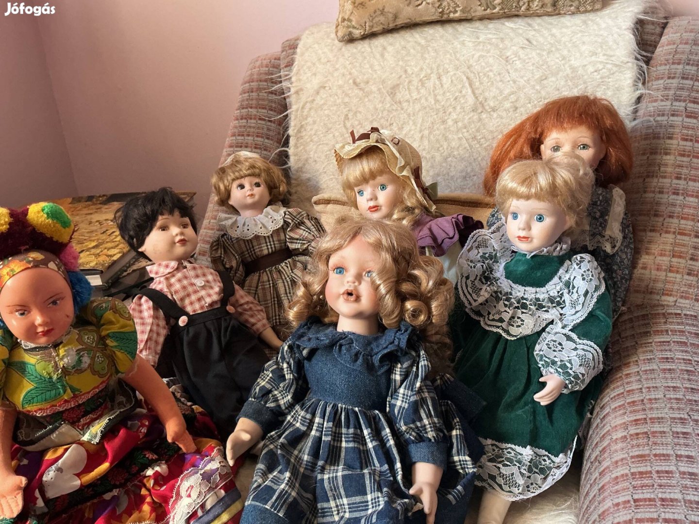 Eladó 7 db baba. A mezőkövesdi és a barna ruhás arca kissé sérült, a többi hibátlan. Kettő babatartó állvány is jár hozzájuk. Együttes áruk 10000.-. Postázom szívesen.