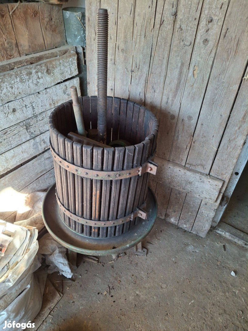 Eladó a képen látható régi szőlőprés. Rendeltetés szerű használatban volt, masszív, erős vasszerkezettel rendelkezik, jó nehéz. Minden tartozéka a kosárban van. Az ár irányár! Szállításban, rakodásban nem tudok segíteni.