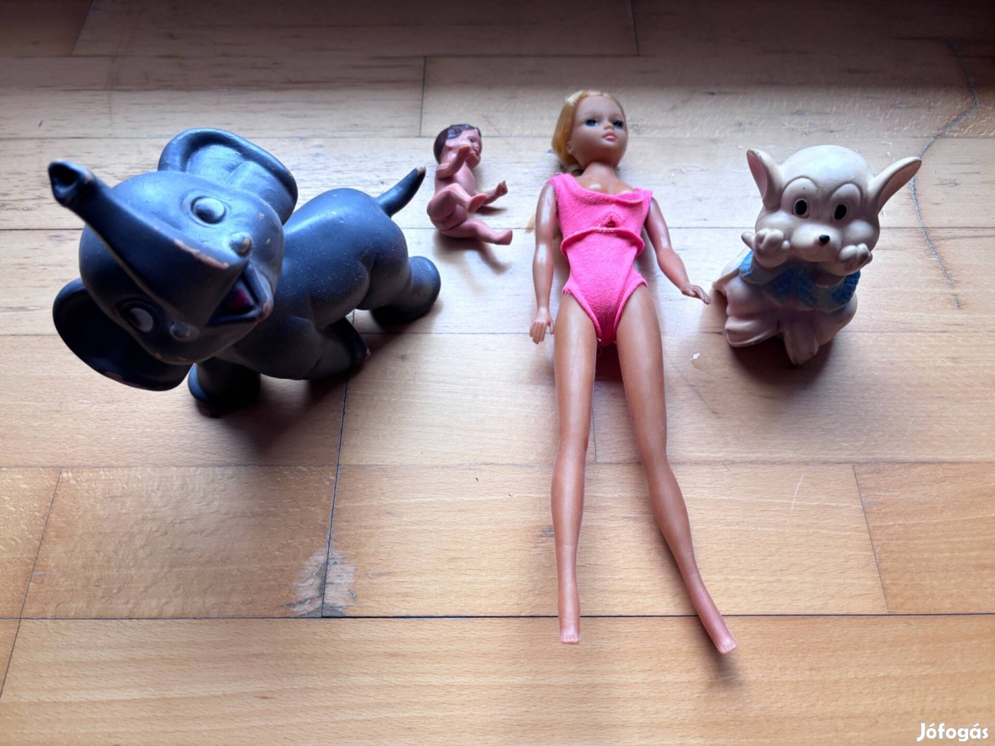 3 db gumi játék 1967-ből és 1 db napbarnított Barbi a '70-es évekből. A Barbi honkongi gyártmány, eredeti fürdőruhában a képeken látható állapotban.