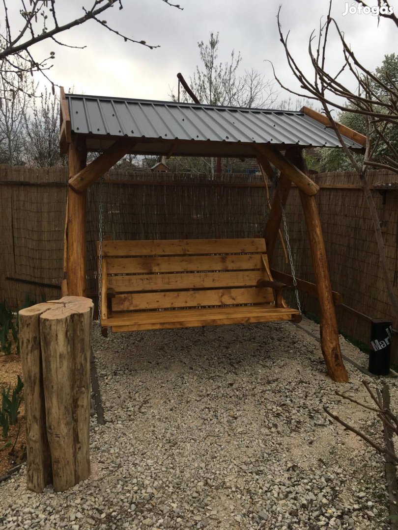 Fenyő,akác,nyárfarönk alapanyagból készitett 2 személyes kényelmes hintaágy karfával, 3 soros polifárbe boróka tölgy szinben festve'antracit hullámlemez tetővel.