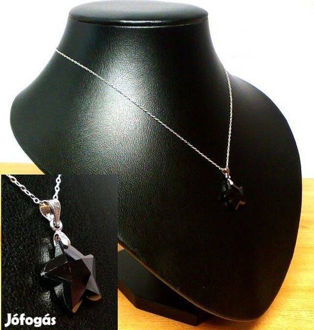 Ródium bevonatos ékszerfém karimával, gyönyörű, ragyogó gyémánt-fekete, Ívelt karú csillag alakra csiszolt kristály. Swarovski jellegű csiszolt kristály medál.