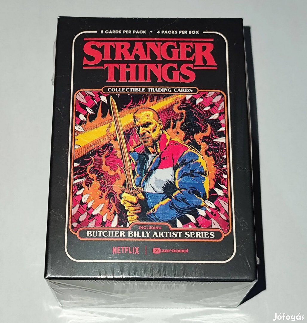 Eladó a képeken látható Stranger Things Butcher Billy Artist Series Blaster Box új, bontatlan állapotban (Zerocool). A dobozban 4 kártya csomag található, minden csomagban 8 db kártya van, köztük exkluzív ritkaságok, számozott parallel lapok (2022-es kiadás).