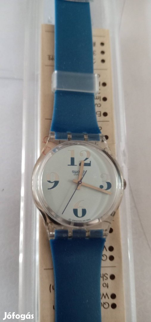 Eladó a képeken látható kifogástalan állapotú Swatch karóra. 33mm-es műanyag, átlátszó tok. Kék műanyag szíj, jelzett csat, saját dobozában .