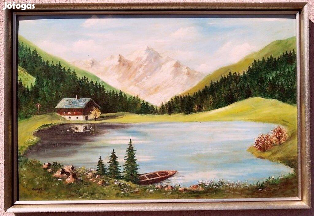Tiroli tájkép erdei tóval, és házikóval, szignált festmény Ausztriából