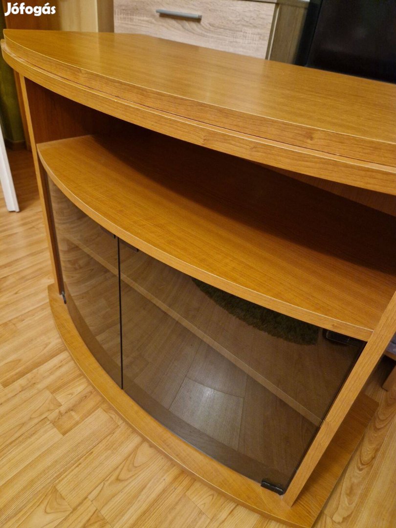 Eladó egy hajlított üvegajtós tv szekrény, forgatható lappal. Megkímélt állapotban.