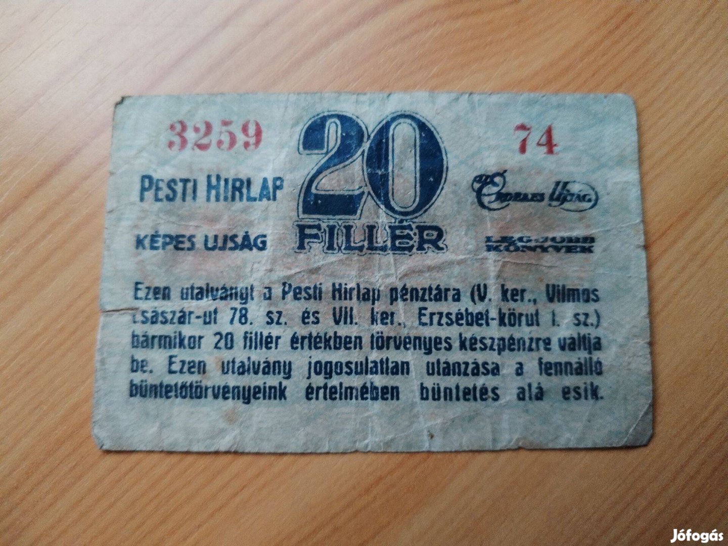 1920-as kiadású papírpénz Pesti Hírlap 20 filérese