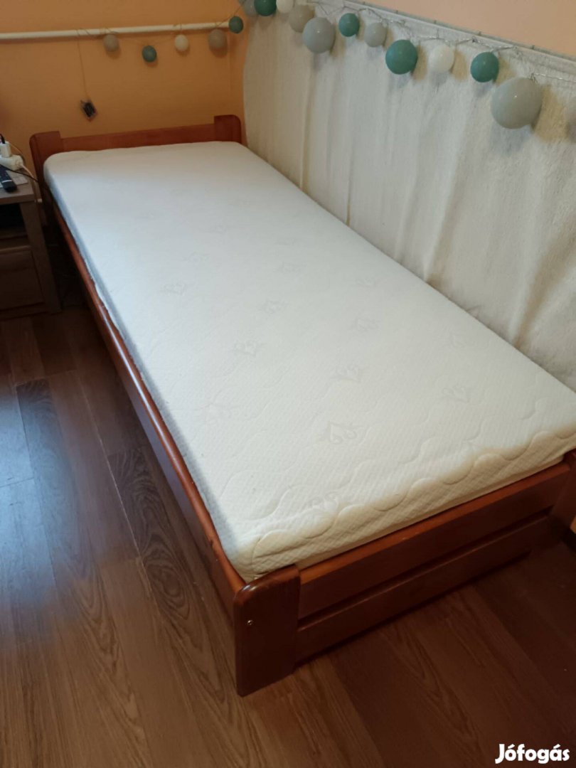 Kiváló állapotban lévő, masszív fa ágykeret és egy vastag, minőségi COCO matrac eladó! Egyfős, 80x200 cm-es fekvőfelületével ideális választás vendégágynak, gyerekszobába vagy kisebb hálószobába egyaránt.