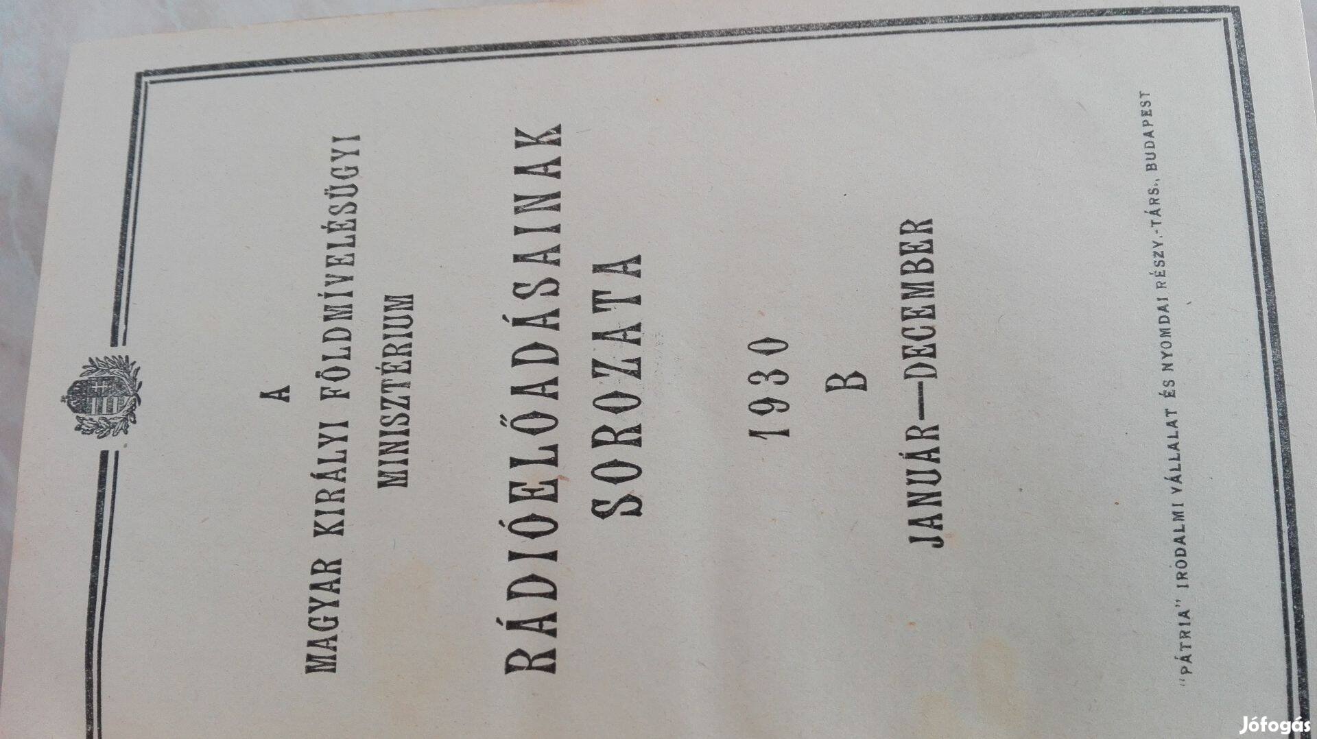 A Magyar Királyi Földmívelésügyi Minisztérium 1930-as Rádióelőadásainak sorozata Jutalom könyv