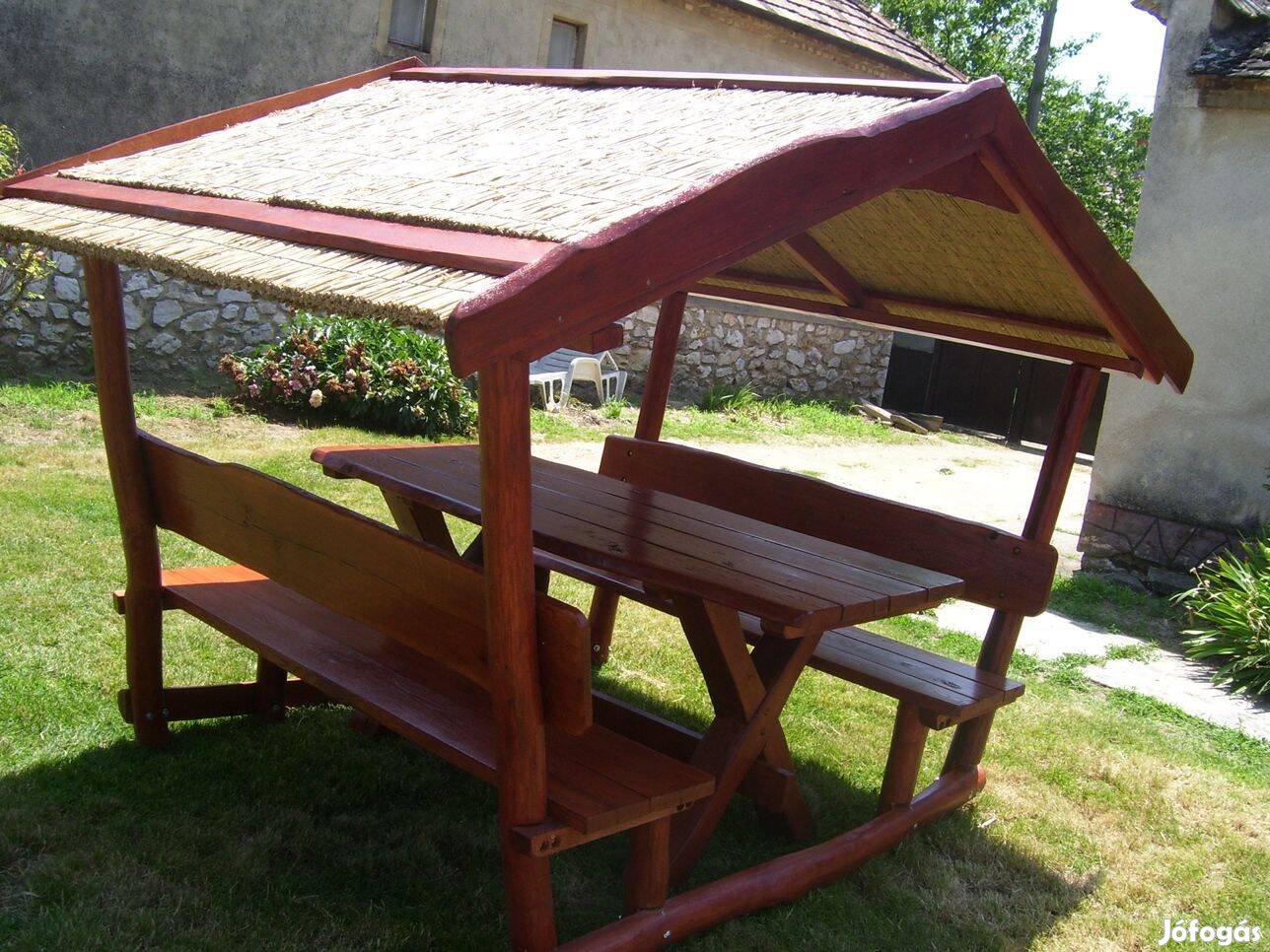 Nádtetős kerti kiülő akác oszlopból tölgy lapokkal