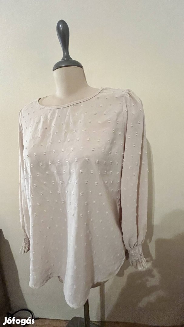 Eladó egy gyönyörű, bézs színű, apró pöttyös textúrájú (plumeti) női blúz. Nagyon könnyű, lágy esésű anyagból készült, ami elegáns megjelenést kölcsönöz.