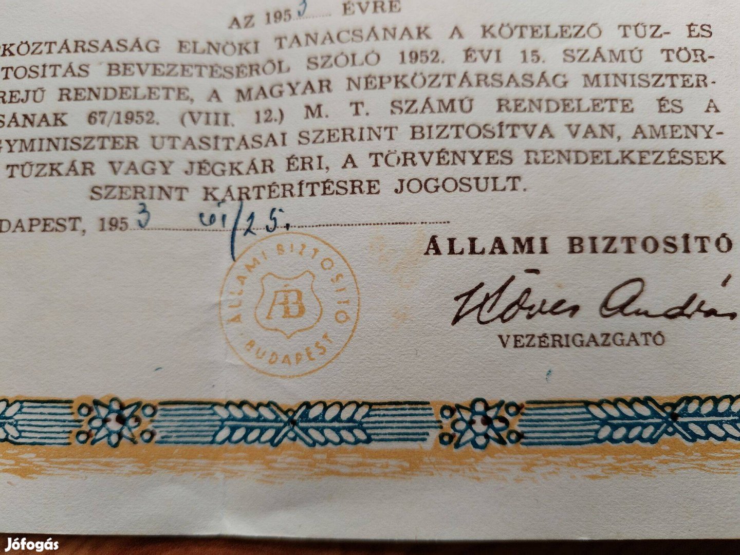Biztosítási okirat tűz és jégkár esetére 1953-as Állami Biztosító