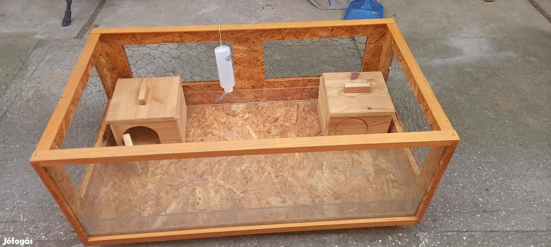 Eladó állatketrec 2db házikóval és itatóval. Az alja és az oldala polikarbonáttal bélelt és az egyik oldala edzett üveg. Gurulós kialakítású. Szállítás nem megoldható.