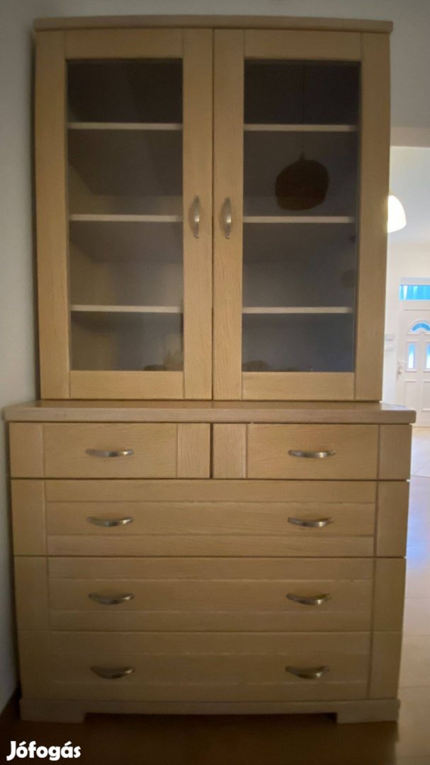 Eladó tömörfa, egyedi gyártású tölgyfa Tálalószekrény masszív fiókokkal, üvegezett ajtókkal.