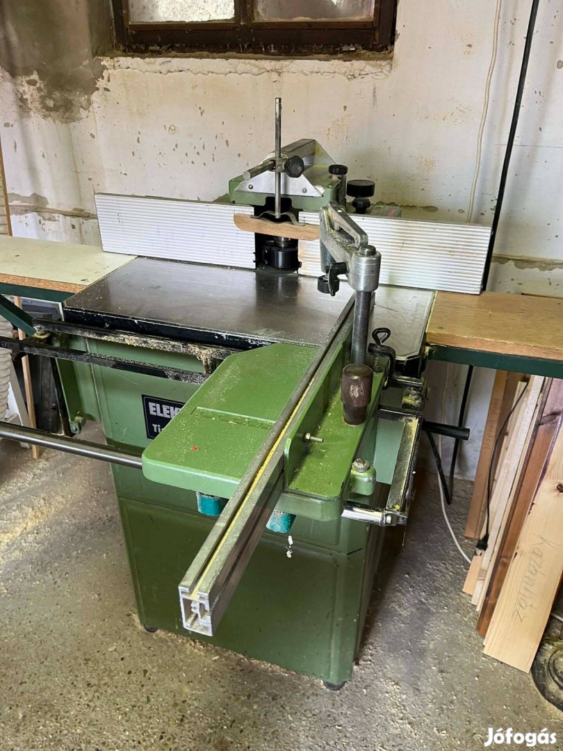 Eladó a képeken látható Elektra Beckum gyártású asztali marógép 380 V-os , marótengely átm. 30 mm, marótengely emelhető valamint süllyeszthető és dönhető, maró ütköző burkolat a tengelyhez viszonyítva előre és hátra állítható, maróütköző talpakon finom állítási lehetőség van, marótengely csapágyak újak, asztalhosszabbító mindkét oldalt, valamint csapozó kocsi munkadarab leszorítóval, ékszíjjal állítható marótengely fordulat,