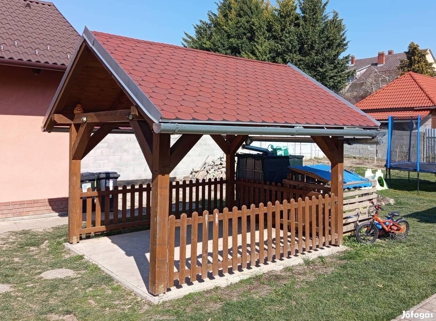 Eladó a képeken szereplő filagória,kerti kiülő de egy autó is elfér alatta.A tető zsindelyes fedésű alatta lambéria van.