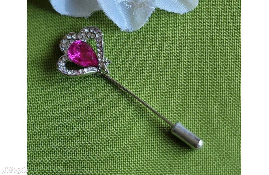 Hajtókatű, kitűző HAT01 - Strasszköves dupla szív pink kővel 53x20mm