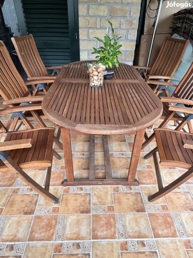 Jutlandia márkájú, használt, kerti, fa, étkezőgarnitúra eladó! 6db összecsukható, dönthető támlás szék, 6db (4+2) párnával. A masszív asztal bővíthető, középen kinyitható toldással. Egy szék javított lábbal, tökéletesen használható, stabil állapotban.