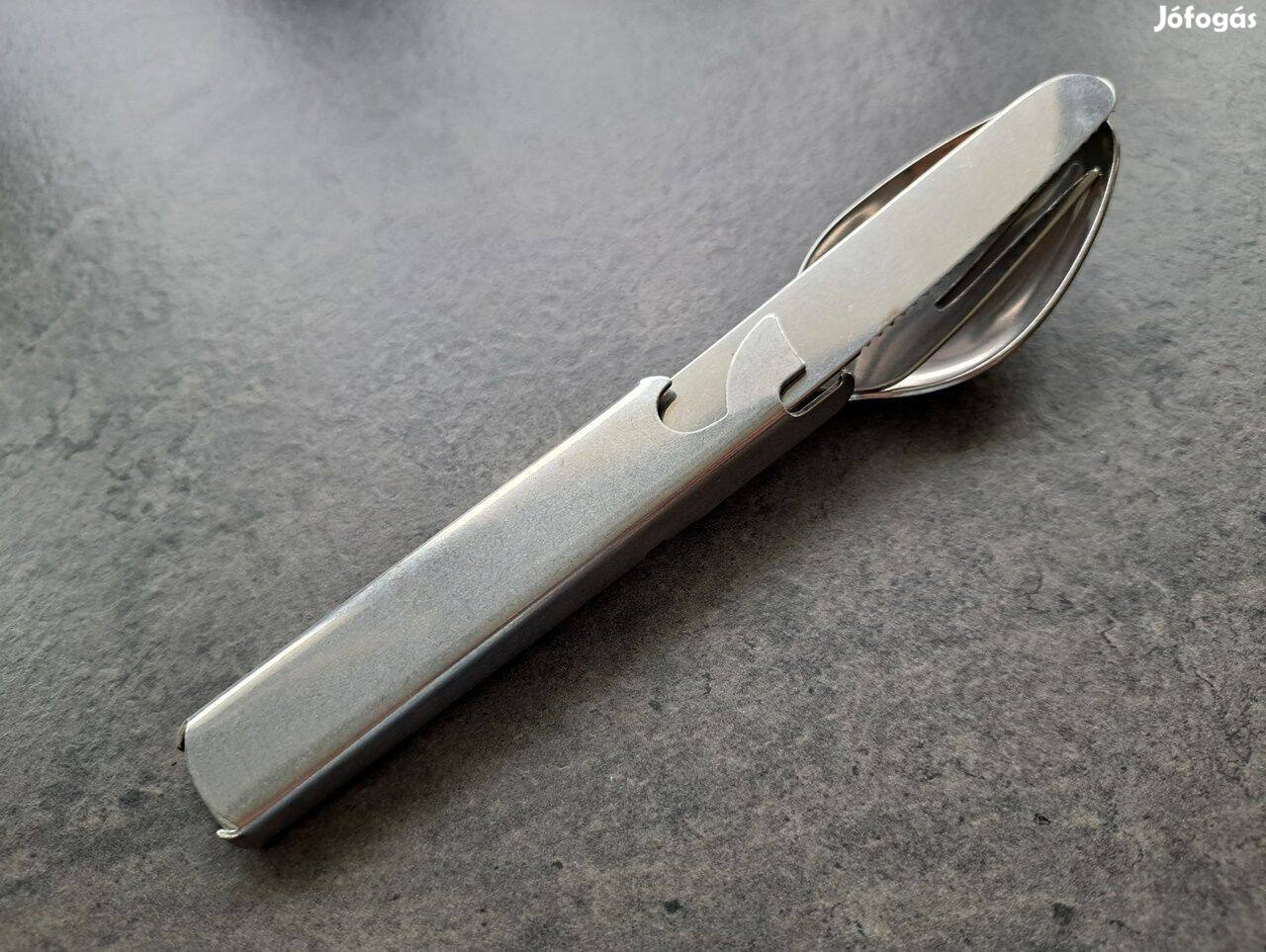 Eladó a képeken látható 4 részes kanálgép. Praktikus eszköz kirándulás, túrázás során, kis helyen elfér, egy kis csomagban kéznél van minden eszköz, ami az étkezéshez szükséges.