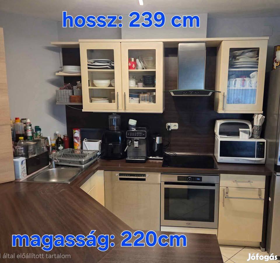 Eladó konyhabútor. Az ár tartalmazza a bosch mosogatógépet, whirpool indukciós lapot és whirpool sütőt (6.érzék, pirolitikus tisztítás). Ezek a gépek max 5 évesek. Ezen felül a páraelszívó is része az árnak. Hüttő nincs hozzá. Összerakásnál nem kell ezt a formát összerakni, csak akkor a munkalapot át kell szabni. Célszerű, ha a vevő (szakembere) szedi szét a bútort, hogy könnyebb legyen összerakni. Március 23ig szét kell szednünk, addig el szeretnénk adni. Külön részenként nem akarjuk eladni. Korának megfelelő állapotú