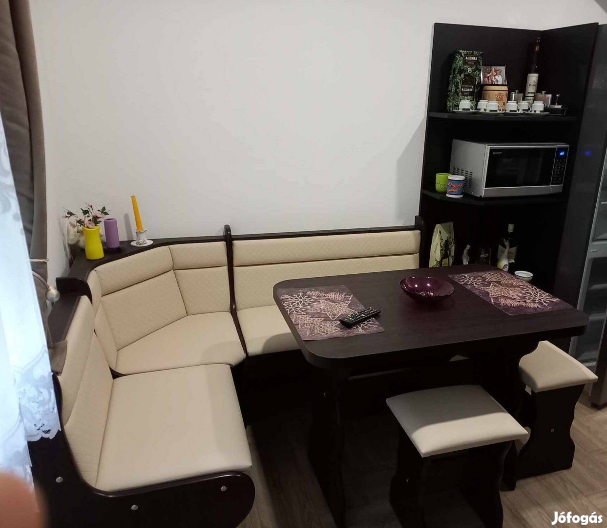 Újszerű, szép, tökéletes állapotú konyhai sarok, asztallal és két kisszékkel, költözés miatt olcsón eladó. Új ára 115e Ft lenne.