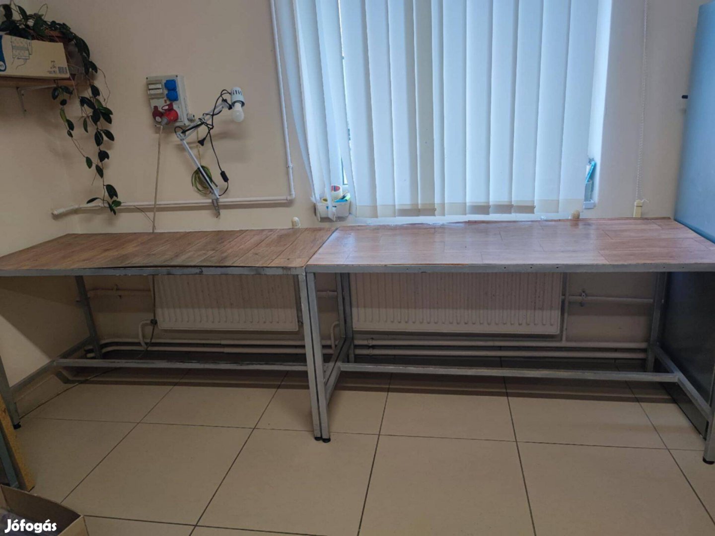 Fémvázas asztalok, OSB lapja PVC-vel van borítva, de van palalapos fekete festéssel is. Mérete: 160x70cm, magassága 80-82 cm ami állítható lábakkal van felszerelve. Jelenleg 12 db asztal van. Több asztal vásárlásánál kedvezményt adok. Ár: 15 000 Ft. / db