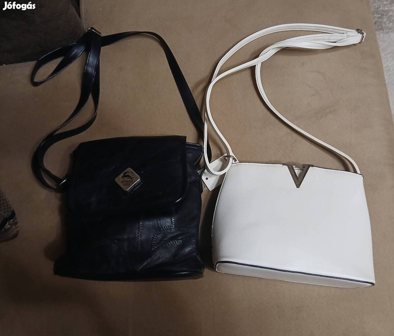 A fekete táska bőr, használt, de hibátlan. A fehér műbőr ,ez viszont új.