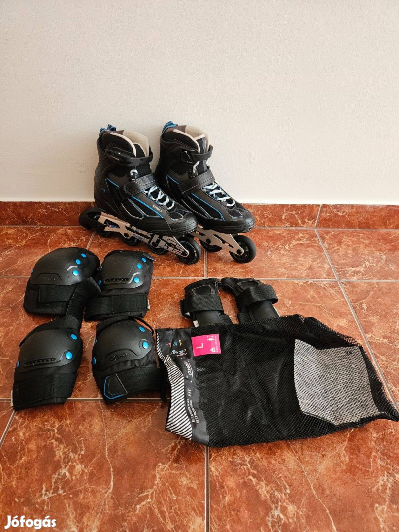 Eladó a fenti Oxelo 100 felnőtt, 43-as méretű, fekete színű görkorcsolya, valamint a szintén Oxelo , L méretű, 3x2 db-os térd-, könyök- és csuklóvédő szett a hozzá tartozó hálós zsákkal.