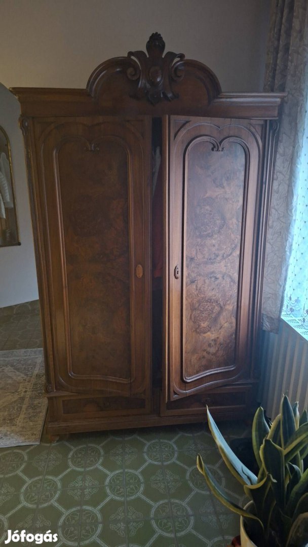 Huszadik század eleje rózsagyökér furnérozású jegyzett származású Bécsbe készült ruhás szekrény eladó telefonos megkeresésre válaszolok