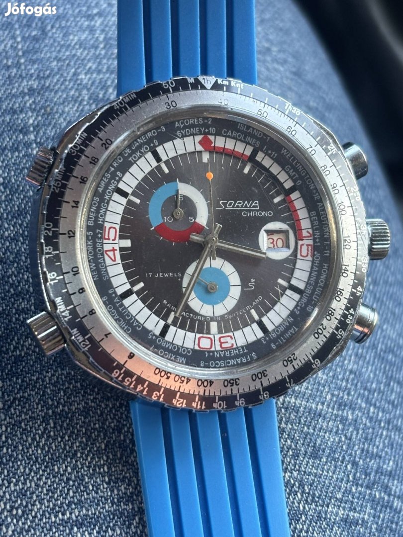 Sorna Chrono World Timer, egy jellegzetes 1970-es évekbeli férfi karóra, amely gyakran egyedi kialakítással rendelkezik, például több koronával és belső forgatható kerettel.