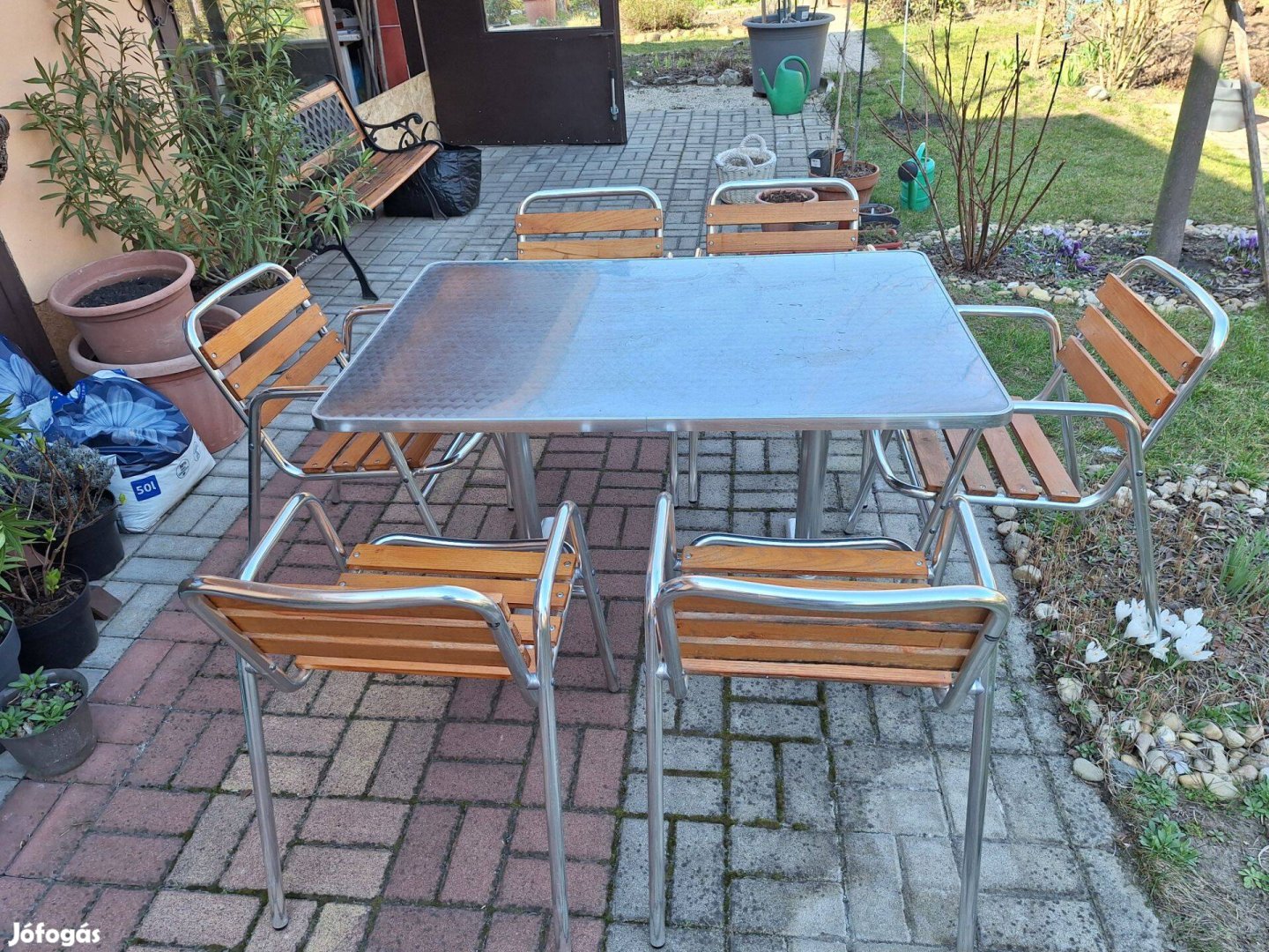 Kitűnő állapotú alumínium asztal, 6db alumínium karos székkel.