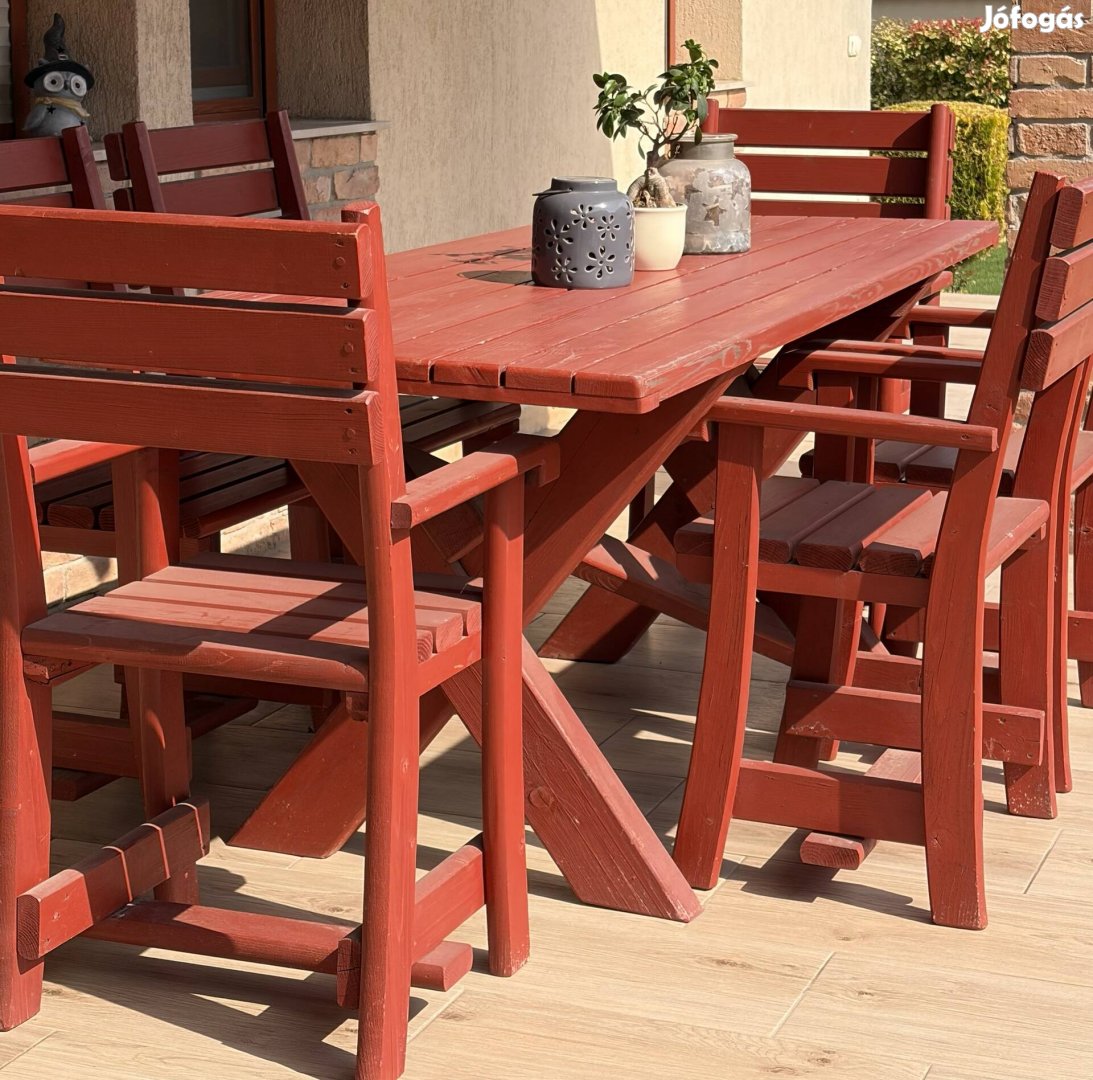 Tömörfenyőfa kerti garnitúra eladó parnákkal együtt.Szállításban nem tudok segíteni!!!!
