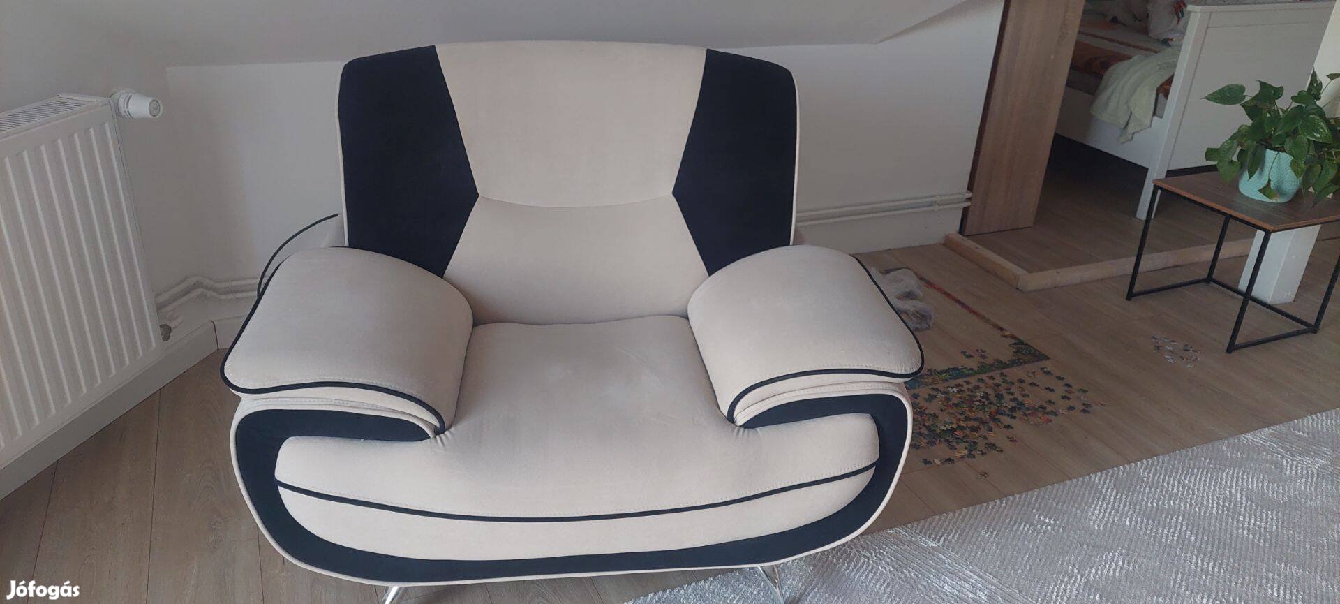 Eladó megkímélt állapotú, bézsfekete színű, modern ülőgarnitúra króm lábakkal.