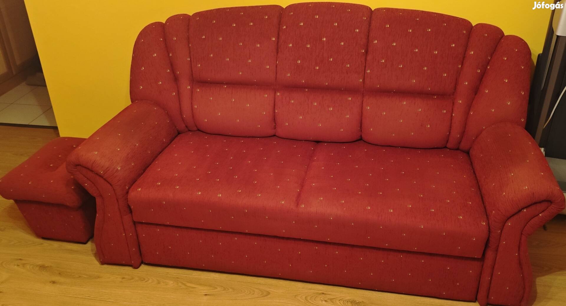 Három személyes kinyitható. Ággyá alakítható. Két személyes ágyneműtartós. És egy kis puff van hozzá. Egyben eladó.