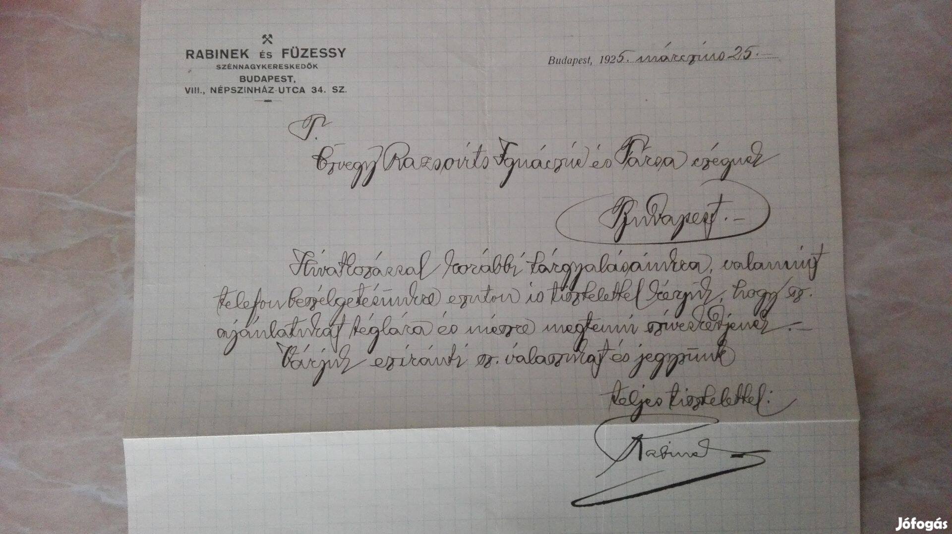 "Rabinek és Füzessy Szénnagykereskedők" 1925-ös üzleti levél