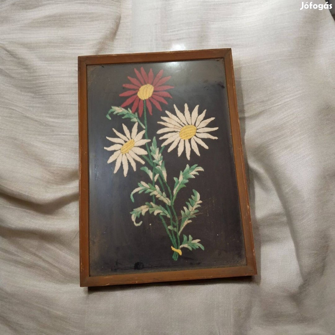 Eladó egy szép, színes virágokat ábrázoló hímzett kép, eredeti fa keretben, üveg alatt. A sötét háttér kiemeli a kézi munka részleteit. Remek kiegészítője lehet egy vidéki stílusú konyhának vagy nappalinak.
