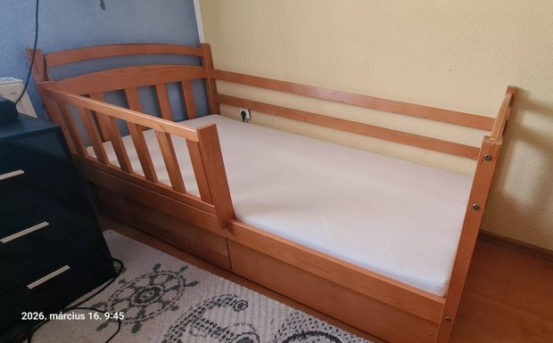 Gyermekágy, ifjúsági ágy leesésgátlóval. 90x200 méretű, fenyő