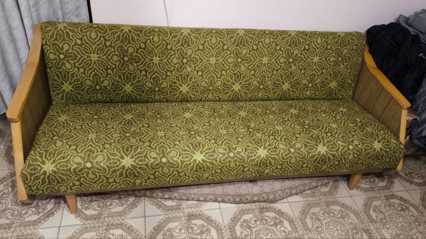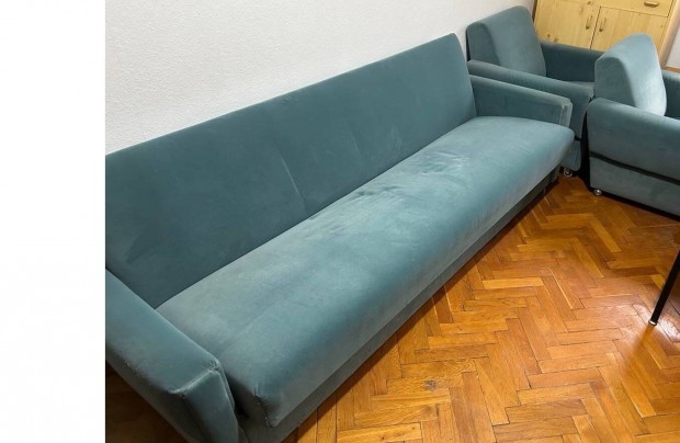 Retró kinyitható kanapé, ágyneműtartóval, 2 db hozzá illő fotel