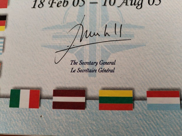 NATO kitüntetés adományozó papírja Balkán Medál 2005-ös