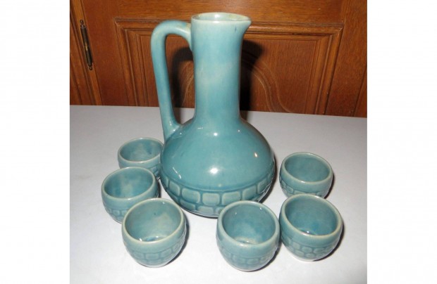 Türkizkék, mázas kerámia likőrös készlet 19 cm pálinkás szett 1960