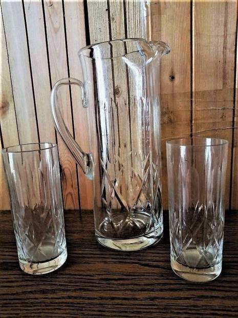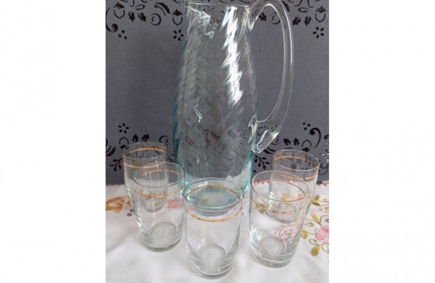 Lazac színű csiszolt mintás üveg kancsó poharakkal