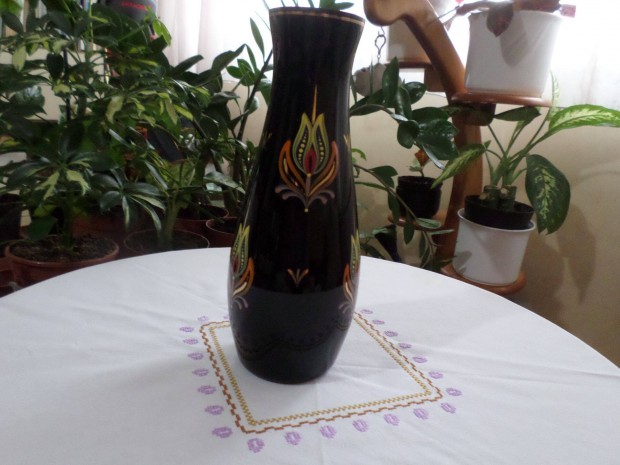 Régi, üveg fekete virág mintás váza