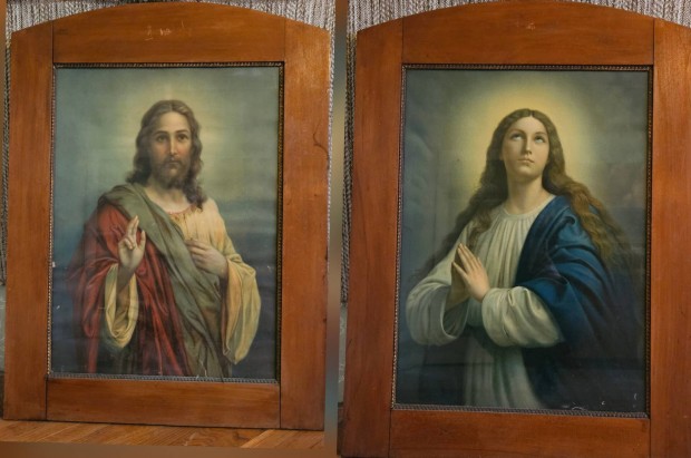 Antik vallási képpár - Jézus és Mária olajnyomat eredeti keretben