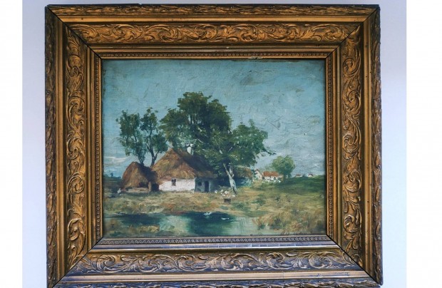 Tájkép, tanya - olajfestmény, antik, aranyozott keretben kb 42x34cm