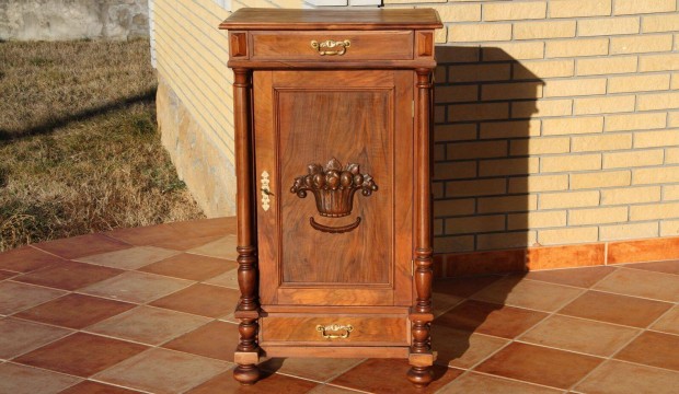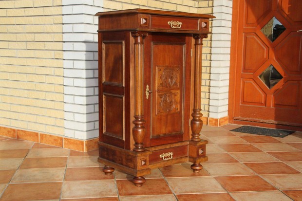 Antik faragott pipatároló fiókos polcos kisszekrény komód szekreter