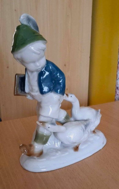 Antik porcelán fiú libákkal, Fasold & Stauch nagyobb nipp