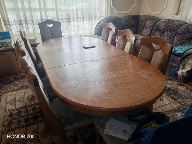 Rusztikus neobarokk jellegű étkező asztal székekkel és tálalószekrén