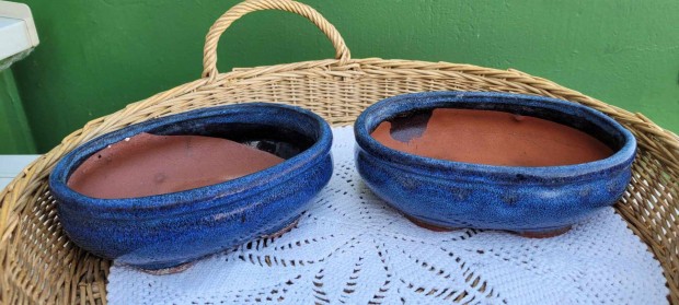 Ovális mázas kerámia bonsai tál pár -2 db kék