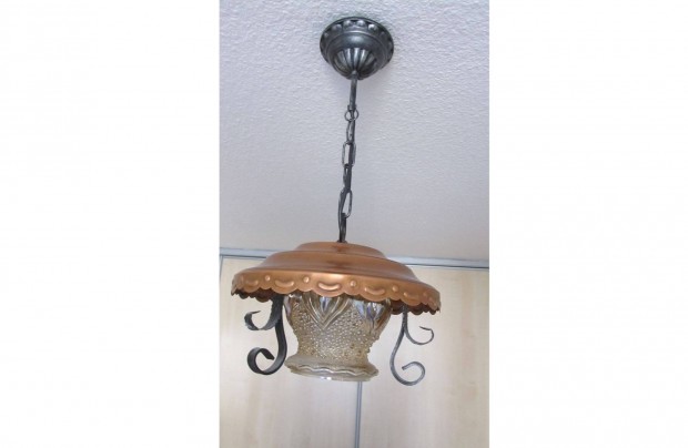 Festett, kovácsoltvas, tejüveg búrás lüszter jellegű lámpa